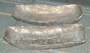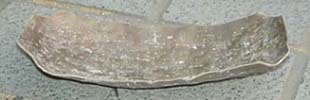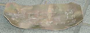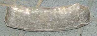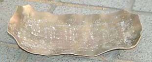 真鍮板を金づちでたたきながら、変形させていく。 各写真を撮った後、コンロで熱して柔らかくし、 さらにたたいてから写真を撮っている。 何度も熱を入れながら成形していく。 これのパーツを2つ作る。 |