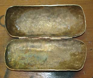 ![]() ![]() ケース本体にロー付けする。 フタがきっちり閉まるように、ヤットコで曲げながら蓋の形を作る。 ケースの内側に布を張れば出来あがり! |
