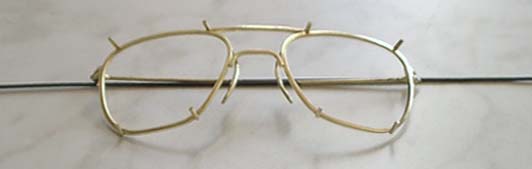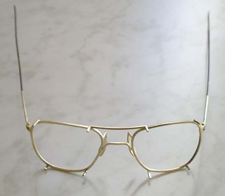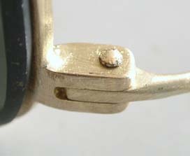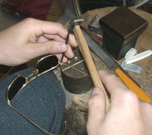 | 再びフレームに柄をつけ、釘を差し込む。 そのままだと抜けてしまうので、かしめる。 釘の後ろが1mm程度出っ張るように、残りを糸鋸で切り取る。 釘の後ろ側をタガネで叩きながら地金を伸ばし、釘の丸線部分の直径を広げる。 |