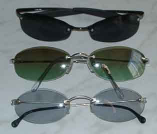 使用するのは、 左写真の一番上のサングラスのレンズ。 (4800円) サングラスはレンズを買うと高いので、 市販のものの中から、形の好きなものを 値段と相談しながら選ぶ。 下2つのサングラスは 構造の勉強をするため 1つ1000円で購入。 |