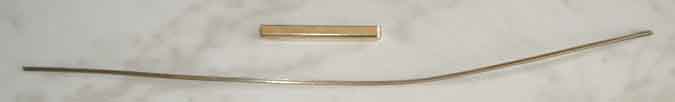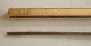 | 一辺 6mm の18金の角棒を ローラーで引き伸ばしていく。 左写真は 4mm 左斜め下の写真は 3mm 下の写真は 1.7mm まで伸ばしたところ |