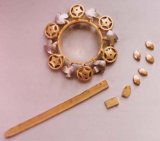 18金の板から葉っぱのパーツを糸ノコで切り取り、