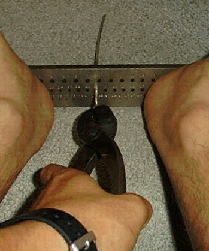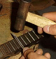 ![]() 板を溝板にのせ、 その上にピアノ線を置き 金槌でたたきながら 丸めていく |