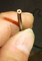 針金(直径 0.5mm〜2.0mm) の作り方: 細い角棒をローラーで作り その先端を細く削る ↓ 線引きに通し えんまを使って引き抜く 少しずつ細い穴に通していき 針金の太さを決める |