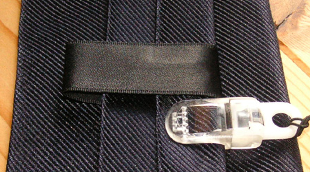 首からぶら下げる身分証明書に携帯用ストラップで装着。