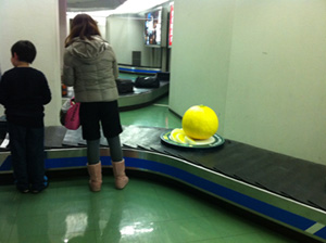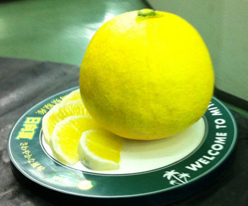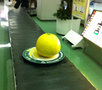 巨大なみかん?何らかのかんきつ類がベルトコンベヤーに乗って現れた。