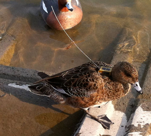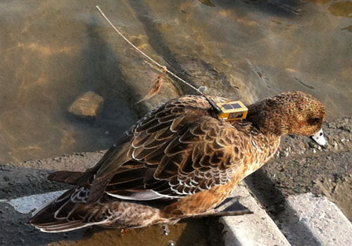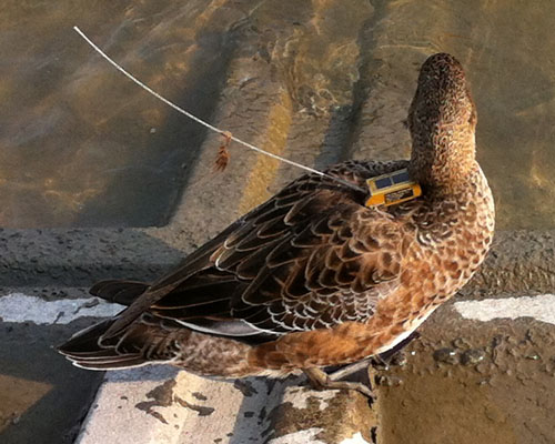 野生のカモの生態調査か、何かの実験か。