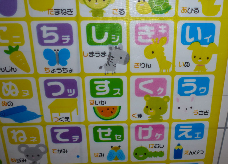 「う」 は 「うさぎ」、「し」 は 「しまうま」、「ろ」 は 「ろば」 の字と絵が書いてある。