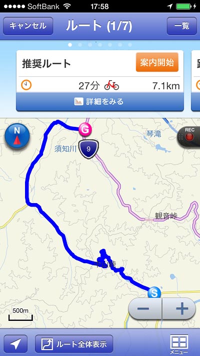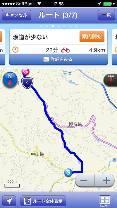 「自転車ナビ」 の推奨コース、中山峠越えルート、7.1km。