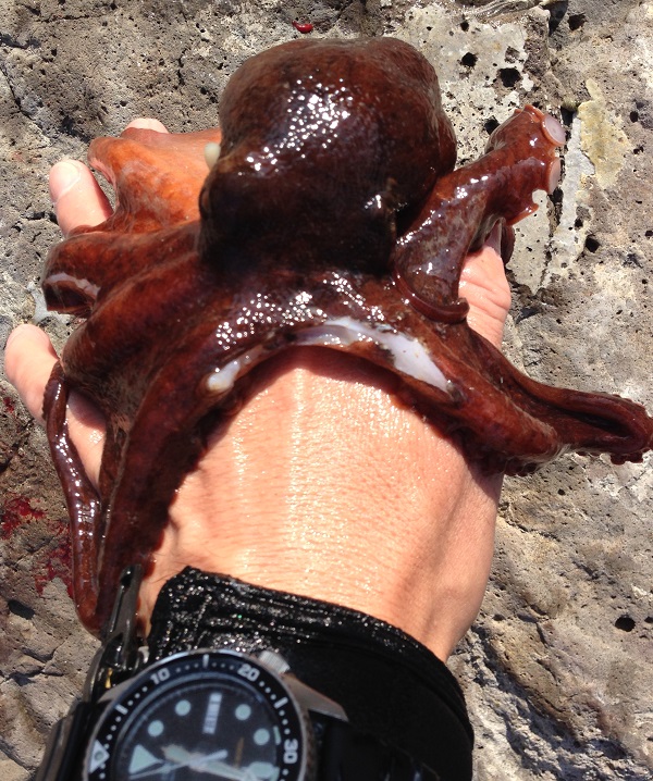 水深70cm程度の浅瀬、岩の隙間にタコの赤ちゃんを発見!