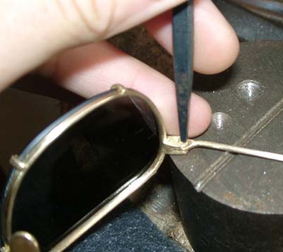 | 再びフレームに柄をつけ、釘を差し込む。 そのままだと抜けてしまうので、かしめる。 釘の後ろが1mm程度出っ張るように、残りを糸鋸で切り取る。 釘の後ろ側をタガネで叩きながら地金を伸ばし、釘の丸線部分の直径を広げる。 |